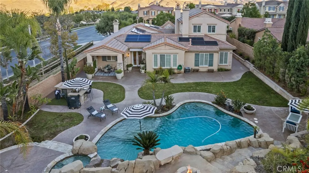 Welcome to this stunning 4-bedroom, 3.5-bath corner lot pool home in the private, guard-gated community of The Retreat. Step inside to discover a light-filled center courtyard surrounded by windows, featuring large planters, a fountain, a fireplace, and even a built-in dog door. Main Level: The main floor offers thoughtfully designed living spaces including two bedrooms with walk-in closets and custom built-ins, connected by a Jack and Jill bathroom. The expansive primary suite is a true retreat, complete with a fireplace, en-suite bathroom with jacuzzi soaking tub, dual vanities, an oversized walk-in shower with bench, and a generous walk-in closet with custom shelving. Entertaining is effortless with a formal living room and dining room, plus a spacious family room featuring built-ins and a cozy fireplace. The gourmet kitchen is a chef's dream with double ovens, a dishwasher, gas range, large center island, and two separate pantries. Upper Level: Upstairs, you'll find flexible living space including a large bonus room, a loft with built-in desk, and a guest bedroom with mirrored closet doors and full bathroom—perfect for visitors or extended family. Outdoor Paradise: The backyard is truly spectacular! Enjoy the sparkling pool and spa alongside a built-in BBQ with ample seating and mini refrigerator. Ascend the dual staircases flanking the pool to reach the gas fire pit, where you can take in breathtaking views of your private oasis below. Additional Features: 3-car tandem garage with storage racks and cabinets, large concrete planters throughout (included!) and leased solar panels. Prime location near the 15 freeway, Dos Lagos shopping center, and the Crossings. This exceptional home offers far more than words can capture—schedule your private showing today!